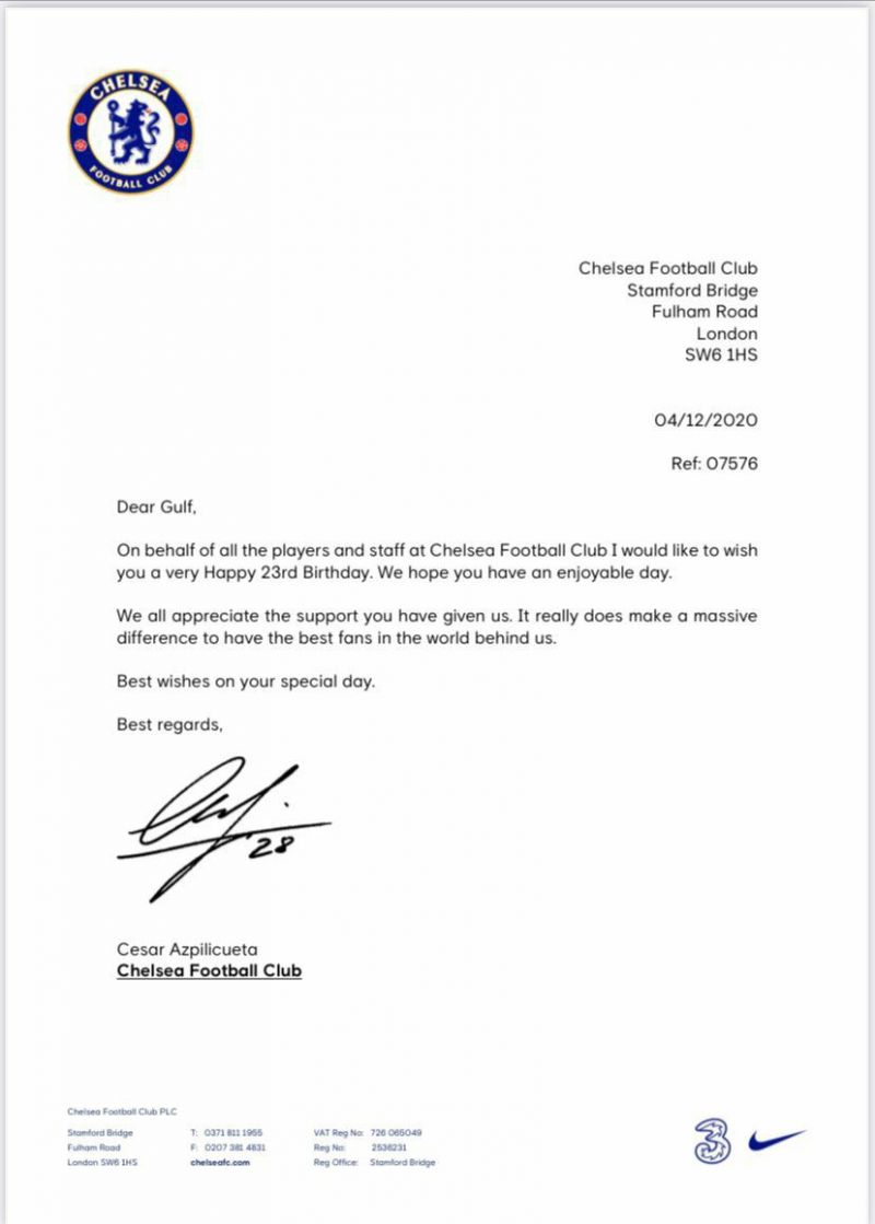 ในนามของผู้เล่นและทีมงานทุกคนที่ Chelsea Football Club ขออวยพรให้คุณมีความสุขมาก ๆ ในวันเกิดปีที่ 23 เราหวังว่าคุณจะมีวันที่สนุกสนาน เราทุกคนยอมรับการสนับสนุนที่คุณมอบให้เรา มันสร้างความแตกต่างอย่างมากที่มีแฟน ๆ ที่ดีที่สุดในโลกอยู่เบื้องหลังเรา ด้วยความปรารถนาดีในวันพิเศษของคุณ