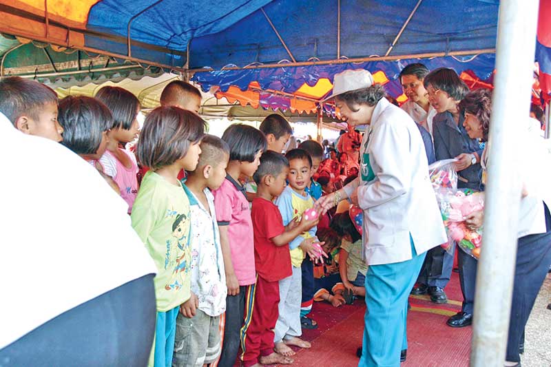 สมเด็จพระเจ้าพี่นางเธอ เจ้าฟ้ากัลยาณิวัฒนา กรมหลวงนราธิวาสราชนครินทร์ ร่วมทรงงานในกิจกรรมและตามเสด็จฯสมเด็จพระศรีนครินทราบรมราชชนนี ในการเสด็จหน่วยแพทย์เคลื่อนที่และทรงเยี่ยมราษฎร ภายหลังทรงปฏิบัติพระกรณียกิจด้านสังคมสงเคราะห์เพิ่มมากขึ้น ทรงรับมูลนิธิเด็กอ่อนในสลัมไว้ในพระอุปถัมภ์ มีผลให้เกิดโครงการพัฒนาเด็กเพิ่มขึ้น เช่น โครงการพัฒนาเด็กในชุมชนและโครงการสาธารณสุขมูลฐานสำหรับแม่และเด็ก ต่อมาทรงรับเป็นองค์นายิกากิตติมศักดิ์มูลนิธิแพทย์อาสาสมเด็จพระศรีนครินทราบรมราชชนนี เมื่อวันที่ 18 สิงหาคม พุทธศักราช 2538