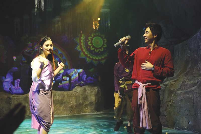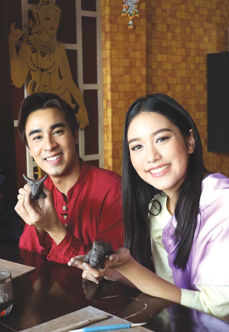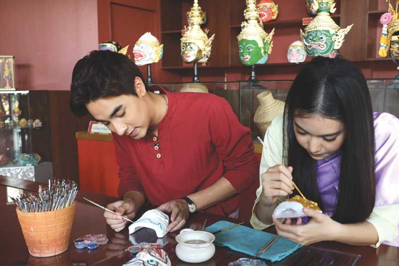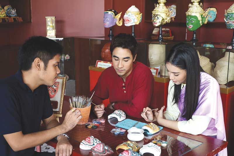 โดยทั้งคู่ออกตัวตั้งแต่พบหน้าก่อนเลยว่าจริงๆ แล้ว ที่นี่คือส่วนหนึ่งของโลเกชั่นที่ใช้ในการถ่ายทำซิทคอมเรื่องนี้ด้วย เพียงแต่ยังไม่เคยเข้ามาที่ไทยโซนจุดนี้ ซึ่งทั้งคู่บอกเลยว่าตื่นตาสุดๆ เริ่มตั้งแต่เดินลอดประตูผ่านปากของหนุมานเข้าสู่บรรยากาศร่มรื่นที่มีทั้งน้ำตกจำลอง บ่อปลาคาร์พสีสันสดใส จากนั้นทั้งคู่เข้าเรียนวิธีการเพ้นท์สีหน้ากากโขน ซึ่งทั้ง 2 ตั้งใจเพ้นต์กันอย่างเต็มที่ โดยมีคุณครูผู้สอนคอยดูแลให้คำแนะนำ