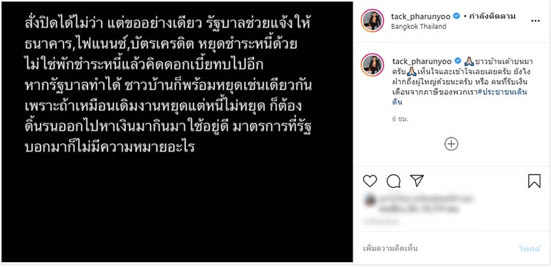 2 ม.ค. 2564 แทค ภรัณยู โรจนวุฒิธรรม นักแสดงหนุ่ม โพสต์ข้อความผ่านอินสตาแกรมส่วนตัว ระบุว่า “สั่งปิดได้ไม่ว่า แต่ขออย่างเดียว รัฐบาลช่วยแจ้งให้ธนาคาร , ไฟแนนซ์ , บัตรเครดิต หยุดชำระหนี้ด้วย ไม่ใช่พักชำระหนี้แล้วคิดดอกเบี้ยทบไปอีก หากรัฐบาลทำได้ ชาวบ้านก็พร้อมหยุดเช่นเดียวกัน เพราะถ้าเหมือนเดิมงานหยุดแต่หนี้ไม่หยุด ก็ต้องดิ้นรนออกไปหาเงินมากินมาใช้อยู่ดี มาตรการที่รัฐบอกมาก็ไม่มีความหมายอะไร”