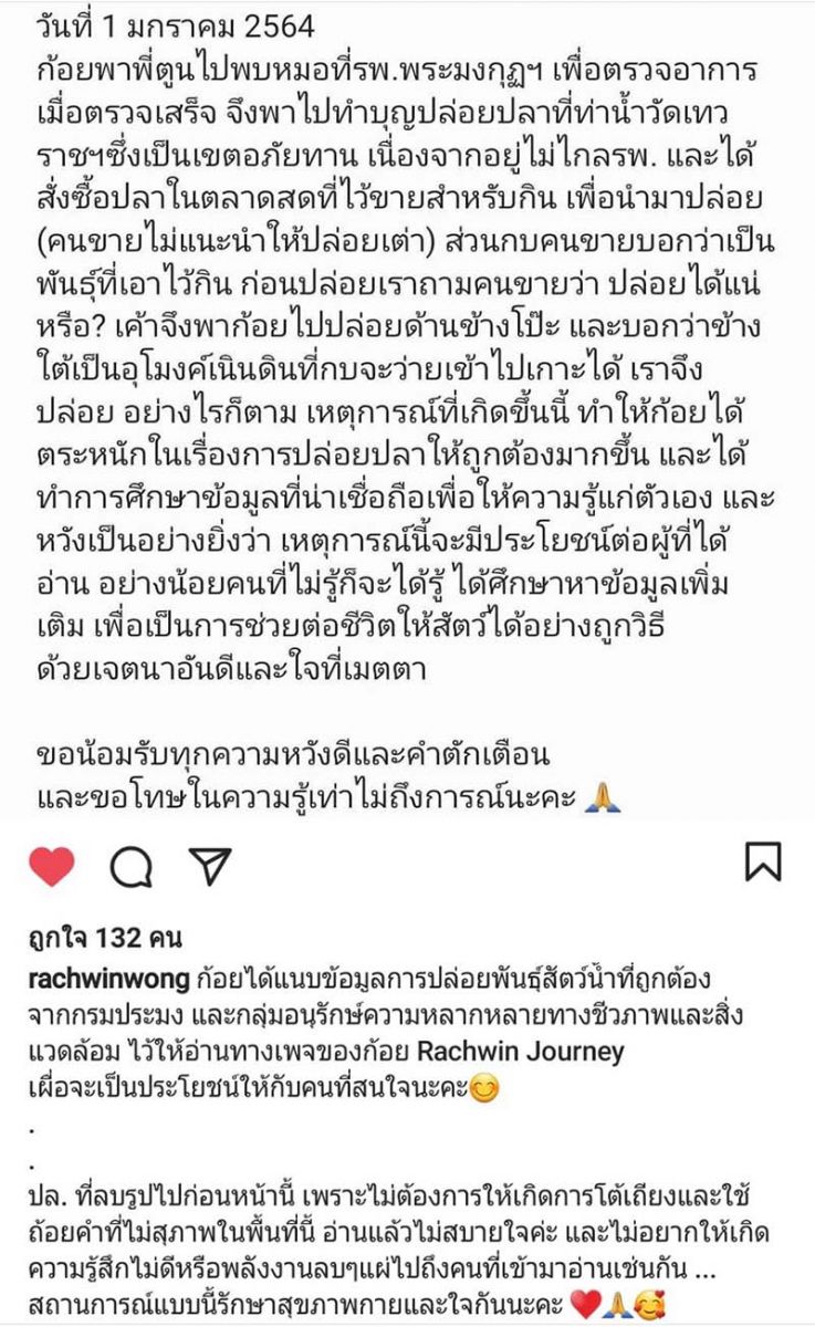 และอีกข้อความว่า ” ก้อยได้แนบข้อมูลการปล่อยพันธุ์สัตว์น้ำที่ถูกต้อง จากกรมประมง และกลุ่มอนุรักษ์ความหลากหลายทางชีวภาพและสิ่งแวดล้อม ไว้ให้อ่านทางเพจของก้อย Rachwin Journey เผื่อจะเป็นประโยชน์ให้กับคนที่สนใจนะคะ