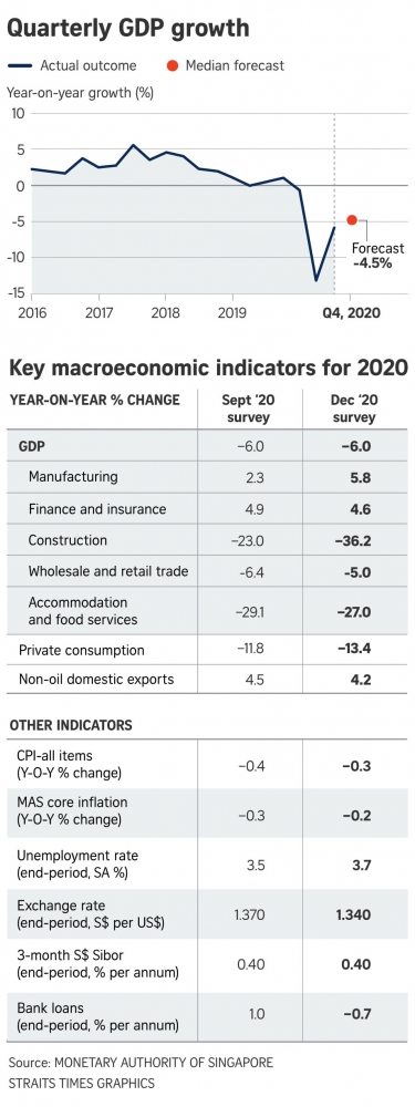 However, their forecast range for 2021 growth narrowed to 5 per cent to 5.9 per cent from 4 per cent to 5.9 per cent, the MAS survey report released on Wednesday (Dec 9) showed.