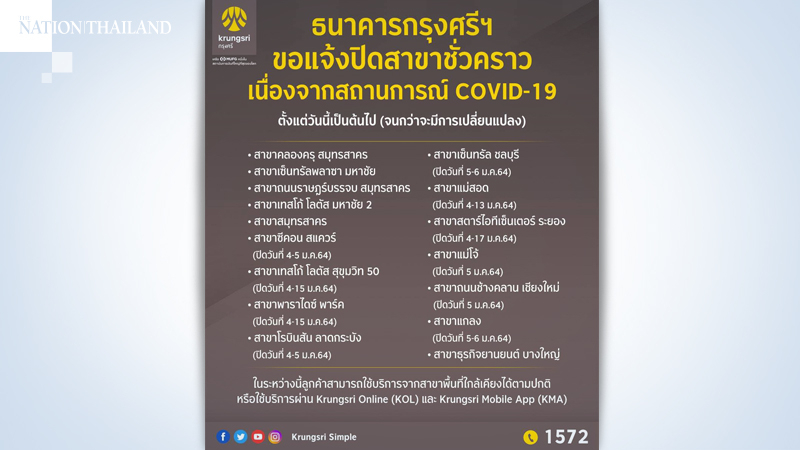 Krungsri closes 16 branches temporarily to combat Covid-19
