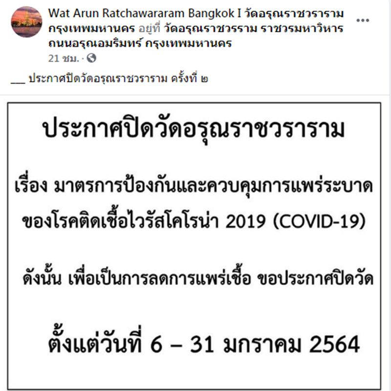 วันที่ 6 มกราคม 2564 เพจเฟซบุ๊ก Wat Arun Ratchawararam Bangkok วัดอรุณราชวราราม กรุงเทพมหานคร โพสต์ข้อความระบุว่า เนื่องจากสถานการณ์โควิดที่กำลังแพร่ระบาดในประเทศ รวมถึงมาตรการป้องกันและควบคุมการแพร่เชื้อไวรัสโคโรน่า (โควิด-19) เราต้องขออภัยที่ต้องแจ้งให้ทุกท่านทราบว่า ทางวัดอรุณราชวราราม จะปิดทำการ เพื่อลดการแพร่ระบาดของเชื้อไวรัส ตั้งแต่วันที่ 6 – 31 มกราคม 2564