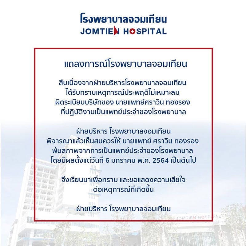 ฝ่ายบริหารโรงพยาบาลจอมเทียน พิจารณาแล้วเห็นสมควรให้ นายแพทย์ศราวิน ทองรอง พ้นสภาพจากการเป็นแพทย์ประจำของโรงพยาบาล โดยมีผลตั้งแต่วันที่ 6 มกราคม พ.ศ. 2564 เป็นต้นไป”