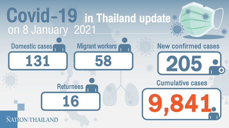 The 205 new confirmed cases include seven Thais returning from Sweden, France, the United States and the Czech Republic, and two foreigners – from India and the United Kingdom – in state quarantine as well as seven illegal border crossers, all from Myanmar.