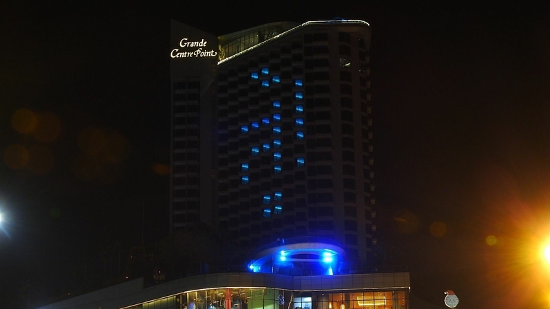 The Grande Centre Point Hotel in Pattaya has put up the Thai word for “fight” in bright lights to motivate people as they battle the new wave of Covid-19 infections.