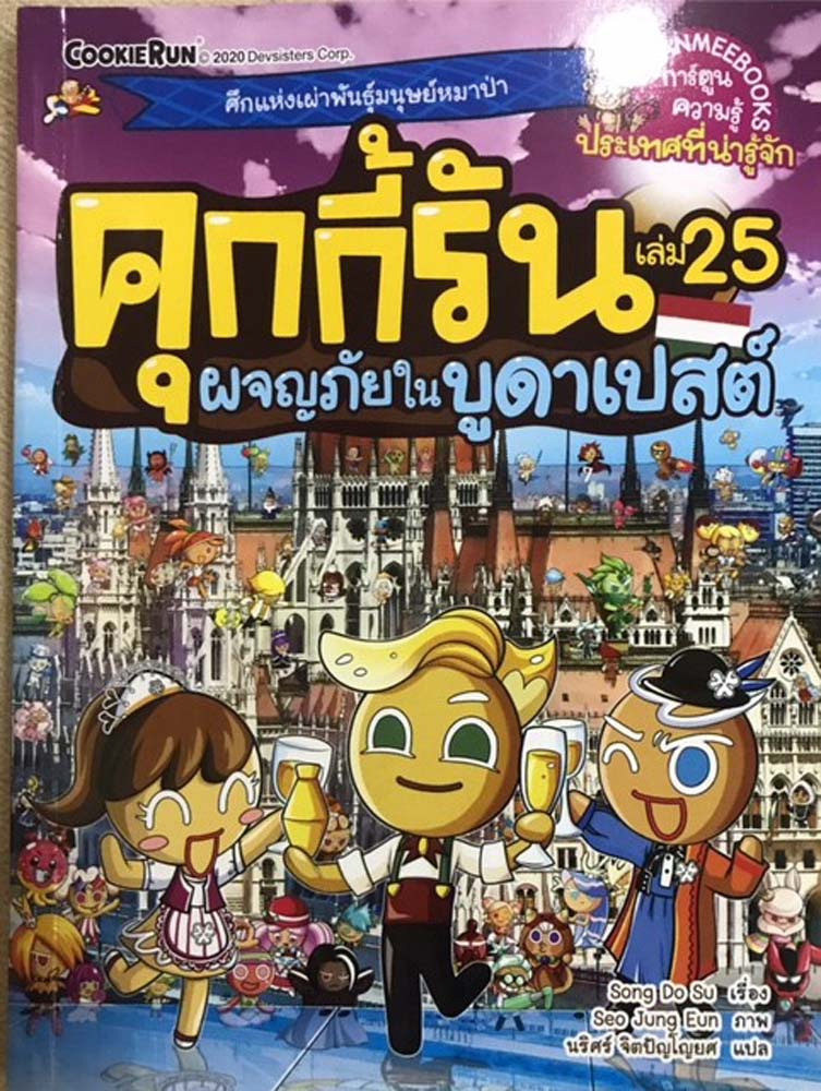 “คุกกี้รัน เล่มที่ 25” ตอนผจญภัยในบูดาเปสต์ เป็นหนังสือการ์ตูนสำหรับเด็กที่ แนะนำเมืองบูดาเปสต์ให้เด็กๆรู้จักด้วยรูปแบบหนังสือการ์ตูนที่เป็นนิยายผจญภัย ซึ่งกล่าวถึงคุกกี้รัน ที่ต้องไปเจอกับ มังกรน้ำแข็ง ที่หวังจะพ่นความเย็นเข้าใส่คุกกี้รัน ให้กลายเป็นน้ำแข็ง ซึ่งเขาจะเอาตัวรอดอย่างไร นอกจากนี้ยังเป็นการเชื่อมโยงไปถึงการช่วงชิงอำนาจแห่งอาณาจักรเพื่อคืนให้กับเจ้าของที่ถูกต้องตามธรรมเนียมโบราณ แต่พวกเขาจะทำได้สำเร็จหรือไม่ การผจญยิ่งเพิ่มความสนุกสนานมากขึ้น พร้อมสอดแทรกสภาพความเป็นอยู่ของเมืองบูดาเปสต์ ประเทศฮังการี ไว้อย่างครบถ้วน จำหน่ายเล่มละ 158 บาท