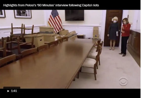 Pelosi showed Stahl where the rioters broke down her office door and shattered an antique mirror, scattering glass. The mob stole computers and rustled through documents. One man sat at a desk, which has since been removed, and “defamed” it, Pelosi said, posing for pictures while leaning back in the chair and resting his boot on the desk.