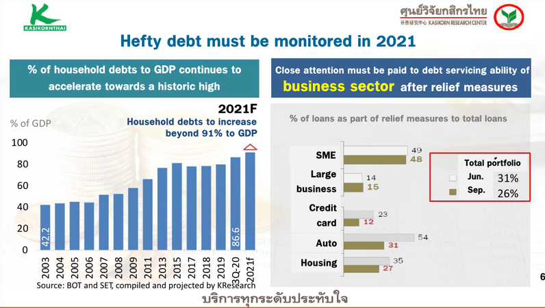 Thanyalak Vacharachaisurapol, deputy managing director at Kasikorn Research Centre, expressed concern that household debt in the third quarter last year stood at 86.6 per cent of GDP, and is expected to rise above 91 per cent by the end of this year.