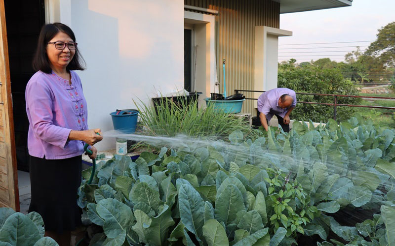 ที่บ้านเลขที่ 108/3 หมู่ 13 ตำบลหัวรอ อำเภอเมือง จังหวัดพิษณุโลก ช่วงเย็นของทุกวัน สองข้าราชการครู คือ นายวันชัย แจ่มนาม ศึกษานิเทศก์ชำนาญการพิเศษ สำนักงานศึกษาธิการจังหวัดพิษณุโลก และนางวลัยพร แจ่มนาม อาจารย์ 3 ระดับชำนาญการพิเศษ โรงเรียนพุทธชินราชพิทยาจะช่วยกันในการดูแลต้นไม้ รดน้ำ พรวนดิน พืชผักที่ปลูกไว้บริเวณดาดฟ้าของบ้านที่ปลูกไว้สำหรับรับประทาน และเป็นผักปลอดสารพิษทั้งหมด พร้อมนำไปทำเป็นอาหารรับประทานในครอบครัว