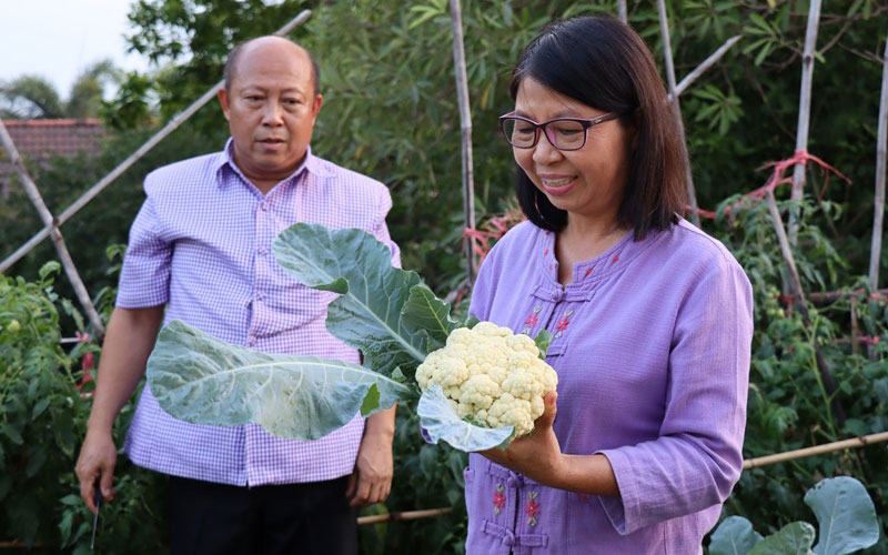 บริเวณดาดฟ้าของบ้าน อาจารย์ทั้งสองท่าน ยังมีผักนานาชนิด อาทิ กระหล่ำปลี คะน้า โหรพา มะเขือเทศ ต้นหอม ผักชี ผักบุ้ง สาระแน่ ฯลฯ นับเป็นอีกหนึ่งตัวอย่างบ้านที่มีบริเวณพื้นที่ปลูกผักมีน้อย แต่ก็นำพืชผักสวนครัวลงในกระถางพลาสติก หรือถุงพลาสติก เป็นภาชนะในการปลูกผัก เป็นแบบอย่างที่ดีของข้าราชการ ในการส่งเสริมการดำรงชีวิตบนฐานวิถีชีวิตใหม่ (New Normal) สร้างความมั่นคงทางอาหารในครัวเรือน มีเหลือก็นำแจกเพื่อนบ้าน เป็นความพอมี พอกิน พอใช้ ตามหลักปรัชญาของเศรษฐกิจพอเพียงได้เป็นอย่างดี