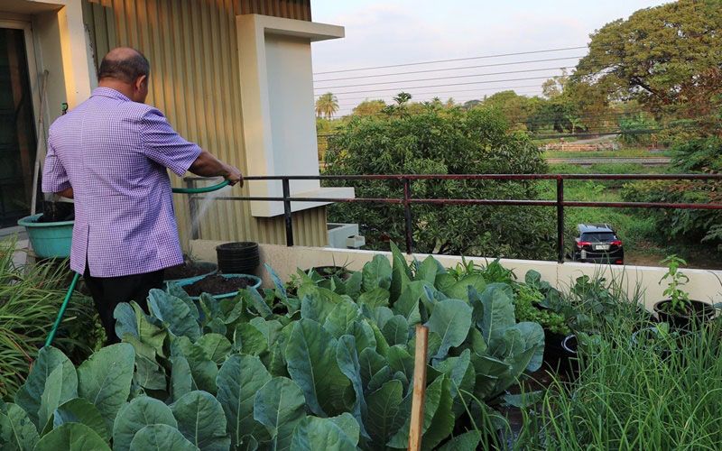 “เรื่องของการปลูกผักสวนครัวจึงเป็นการทำกิจกรรมร่วมกันที่บ้านเราเลยอยากจะทำ แล้วประเด็นสำคัญเลย เราทานอาหารตอนเย็นเราไม่อยากไปตลาดเพราะช่วงนี้ก็อย่างที่ทราบกันสถานการณ์การแพร่ระบาดของโรคมันเยอะ แล้วเราก็รู้สึกว่าถ้างั้นเรามาปลูกผักกันเอง เรามีผักหลายเลยต้นหอม ผักชี คะน้า ผักอะไรที่ต้องไปซื้อที่ตลาด เราพยายามที่จะไม่ซื้อเลย เรามาดูว่ามีอะไรบ้างที่เราต้องไปซื้อเราก็เอามาปลูกเอาไว้บนดาดฟ้า แต่ว่าจริงๆ แล้วเรามีข้างล่างด้วยนะครับมีพืชอื่นๆ อีกหลายรายการที่เราปลูกสรุปง่ายๆ ก็คือเราพยายามที่จะปลูกพืชให้หลากหลาย แล้วก็ให้พอกิน ปลูกแล้วก็เอาไปแจก เอาไปฝาก”