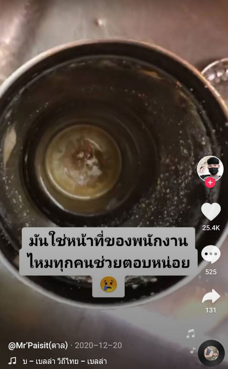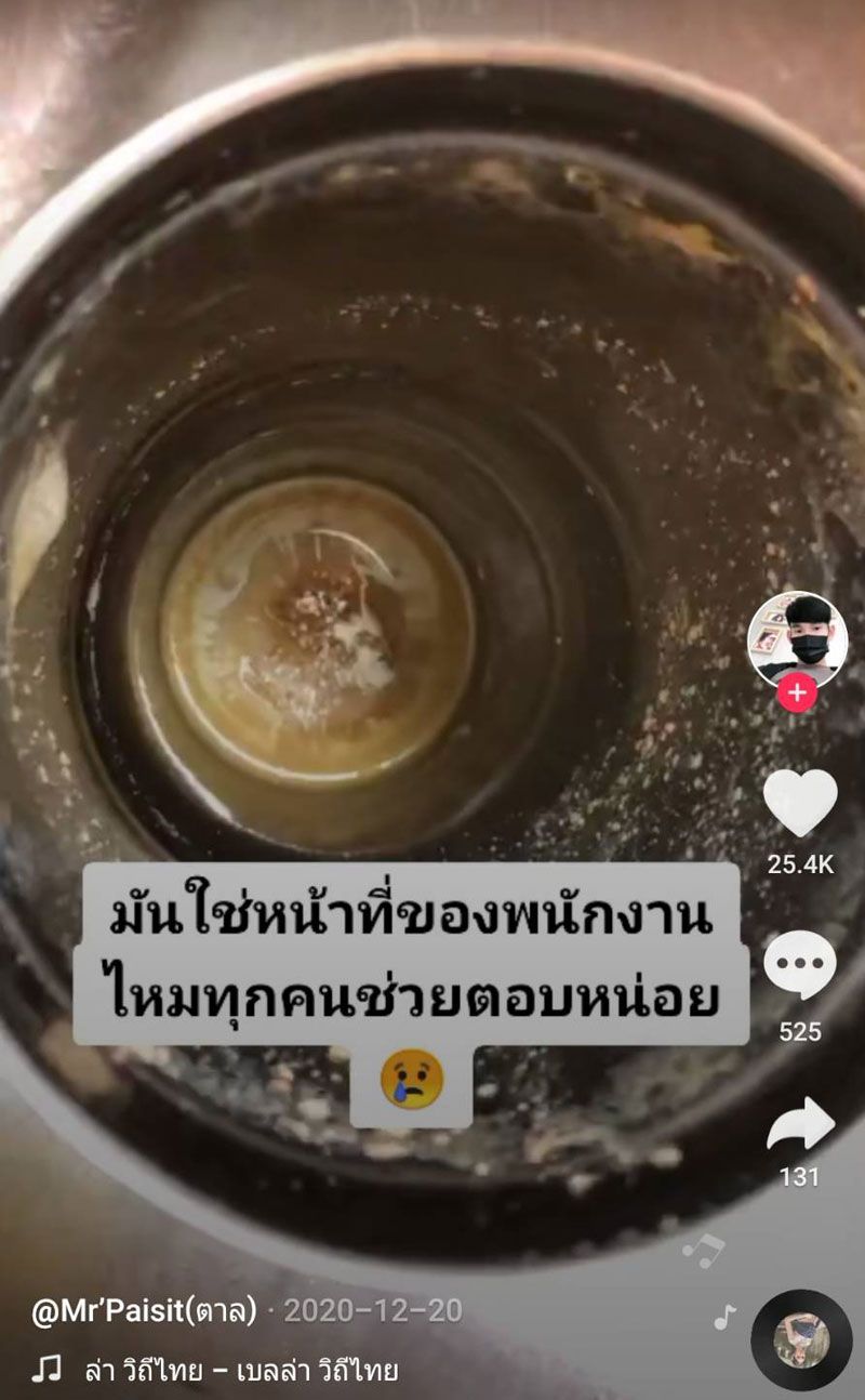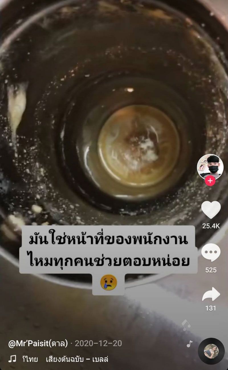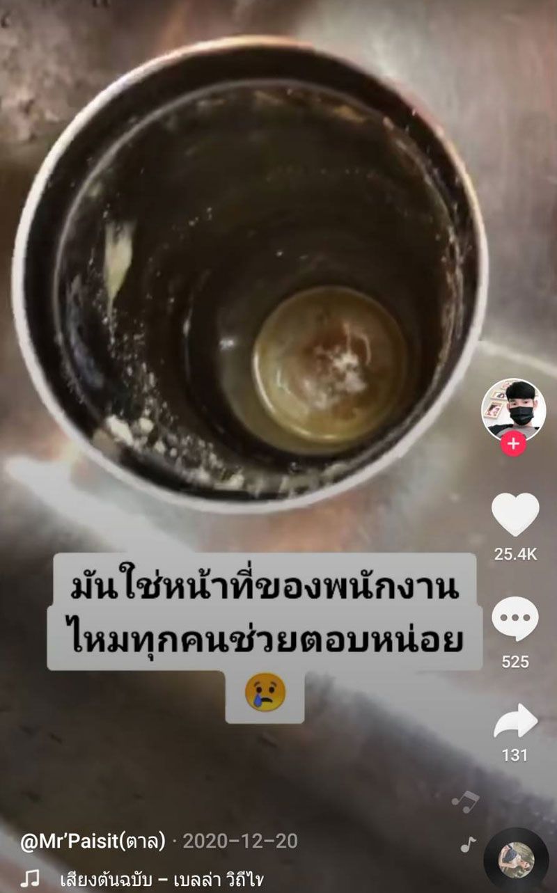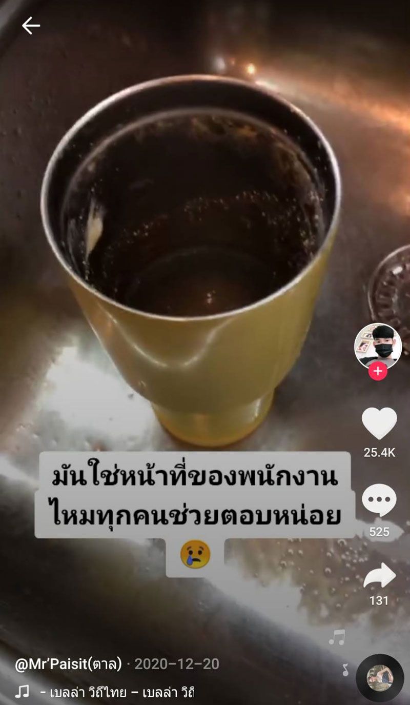 เห็นสภาพแล้วถึงกับอยากเขวี้ยงแก้วทิ้ง! เมื่อผู้ใช้ tiktok ที่ชื่อว่า paisit_2544 ได้โพสต์คลิปที่ลูกค้านำแก้วเก็บความเย็นมาใส่ แต่เมื่อเปิดมาเจอสภาพแล้วเหมือนไม่ได้ล้างมาหลายวัน โดยผู้โพสต์คลิปยังบอกด้วยว่า “มันใช่หน้าที่ของพนักงานไหมทุกคน ช่วยตอบหน่อย”
