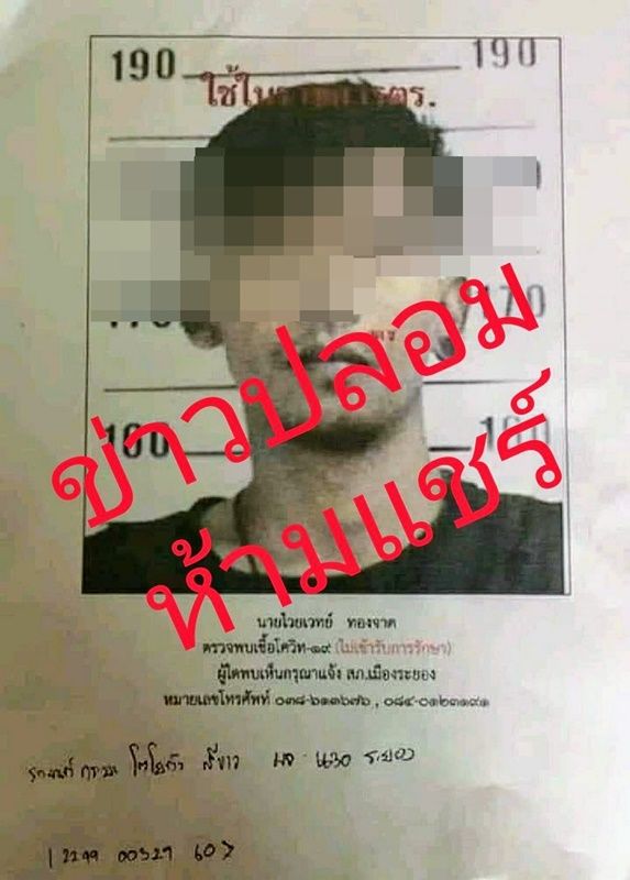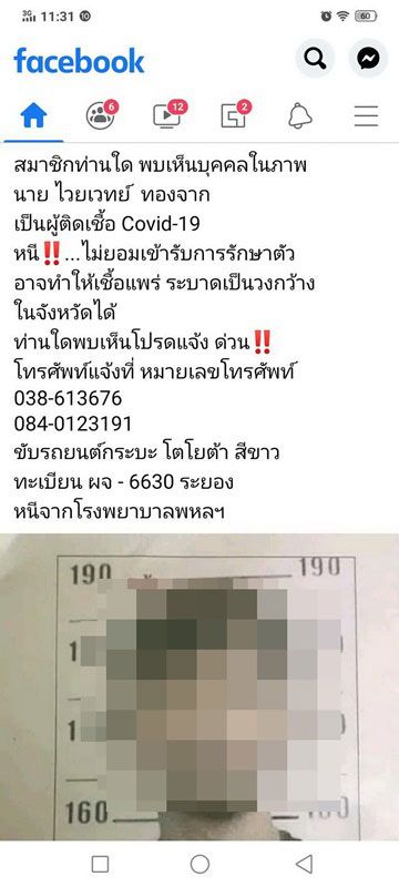 วันที่ 8 ม.ค.64 ผู้สื่อข่าวรายงานว่า มีผู้ไม่หวังดีนำภาพเป็นชายมาโพสต์ลงในโลกโซเชียล พร้อมกับบรรยายว่า… “สมาชิกท่านใด พบเห็นบุคคลในภาพ เป็นผู้ติดเชื้อ COVID-19 หนี…ไม่ยอมเข้ารับการรักษาตัวอาจทำให้เชื้อแพร่ระบาดเป็นวงกว้างในจังหวัดได้ ท่านใดพบเห็นโปรดแจ้ง ด่วน โทรศัพท์แจ้งที่ หมายเลข 038-613676 และ 084-0123191 ขับรถยนต์กระบะโตโยต้าสีขาว ทะเบียน ผจ-6630 ระยอง หนีจากโรงพยาบาลพหลฯ”