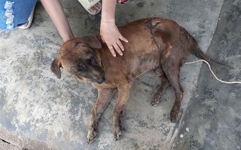 รอดแล้ว!ตั้งชื่อ’เจ้ามะตอย’สุนัขพันธุ์ผสมที่ตกถังยางมะตอยนอนใกล้ตายในสวนปาล์ม