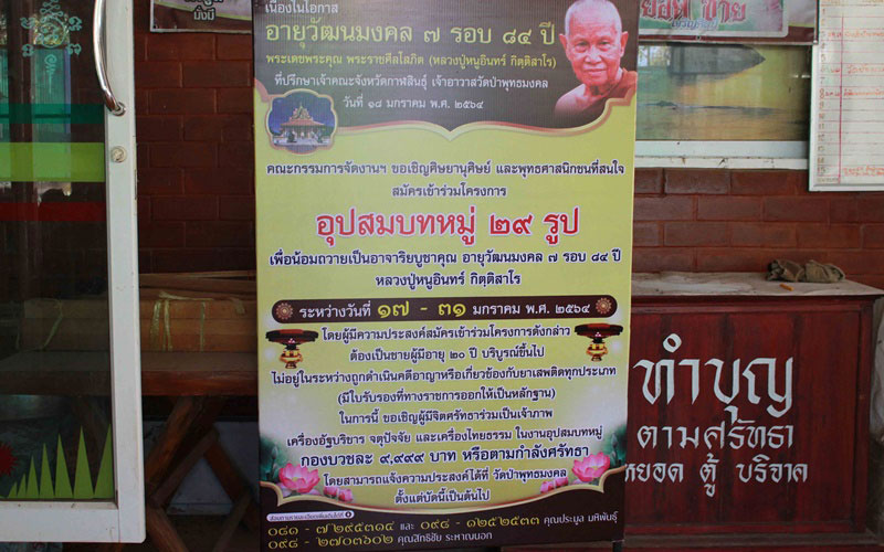 นายสิทธิชัย กล่าวอีกว่า สำหรับพิธีอุปสมบทหมู่ครั้งนี้ จะมีพรศักดิ์ ส่องแสง ศิลปินนักร้องหมอลำชื่อดัง รวมทั้งข้าราชการ ประชาชน ปวารณาตนอุปสมบทจำนวน 29 รูป กำหนดอุปสมบท 15 วัน ระหว่างวันที่ 17-31 ม.ค.64 ซึ่งจะมีแฟนคลับของพรศักดิ์ ส่องแสง และประชาชน มาร่วมอนุโมทนาบุญอย่างคับคั่ง โดยเฉพาะหลวงปู่หนูอินทร์ เป็นพระเกจิสมณศักดิ์ มีศิษยานุศิษย์ทั่วประเทศ จึงคาดว่าจะพากันเดินทางมาร่วมงานเป็นจำนวนมาก