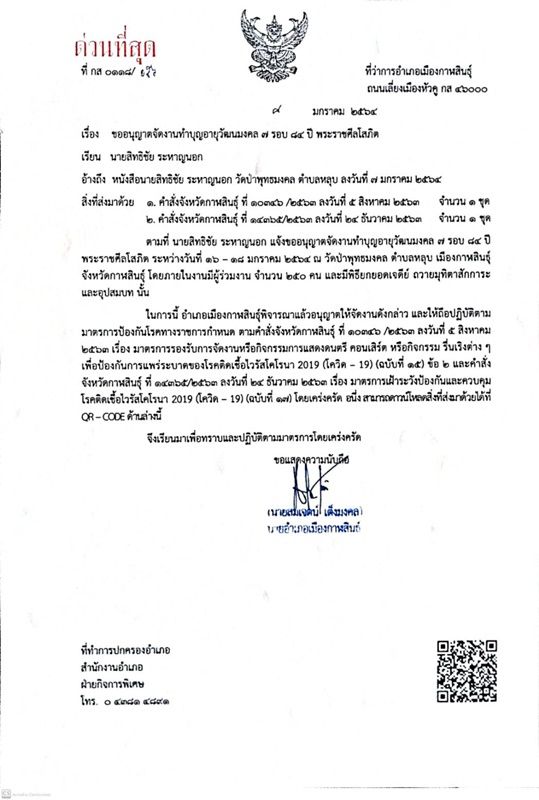 นายสิทธิชัย กล่าวเพิ่มเติมว่า ในช่วงการจัดงานดังกล่าว อยู่ในช่วงสถานการณ์แพร่ระบาดของโรคติดเชื้อโควิด-19 รอบ 2 ทางคณะกรรมการป้องกันโรคติดต่อ จ.กาฬสินธุ์ ได้ออกประกาศห้ามไม่ให้มีการจัดงานหลายประเภท ซึ่งจะเป็นการเสี่ยงต่อการได้รับเชื้อดังกล่าว อย่างไรก็ตาม ในส่วนจัดงานครั้งนี้ ทางคณะกรรมการวัดป่าพุทธมงคลและศิษยานุศิษย์ ได้มีหนังสือขออนุญาตจัดงานไปทางฝ่ายปกครอง อ.เมืองกาฬสินธุ์ และได้รับอนุญาตให้ดำเนินการจัดงานได้ตามกำหนด แต่ทั้งนี้ ทุกกิจกรรมที่จัดขึ้น ต้องเป็นไปตามมาตรการป้องกันการติดเชื้อโควิด-19 อย่างเคร่งครัด โดยจะมีการจำกัดจำนวนคน เจ้าหน้าที่สาธารณสุข อสม. ตั้งจุดคัดกรอง ทุกคนสวมหน้ากากนามัย ตรวจวัดอุณหภูมิร่างกาย ล้างมือด้วยเจลแอลกอฮอล์ รักษาระยะห่าง เป็นต้น