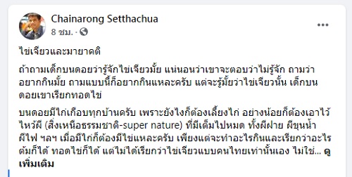 11 มกราคม 2564 นายไชยณรงค์ เศรษฐเชื้อ อาจารย์ภาควิชาสังคมวิทยาและมานุษยวิทยา คณะสังคมศาสตร์และมนุษยศาสตร์ มหาวิทยาลัยมหาสารคาม โพสต์บทความหัวข้อ “ไข่เจียวและมายาคติ” ผ่านเฟซบุ๊ก มีเนื้อหาดังนี้…