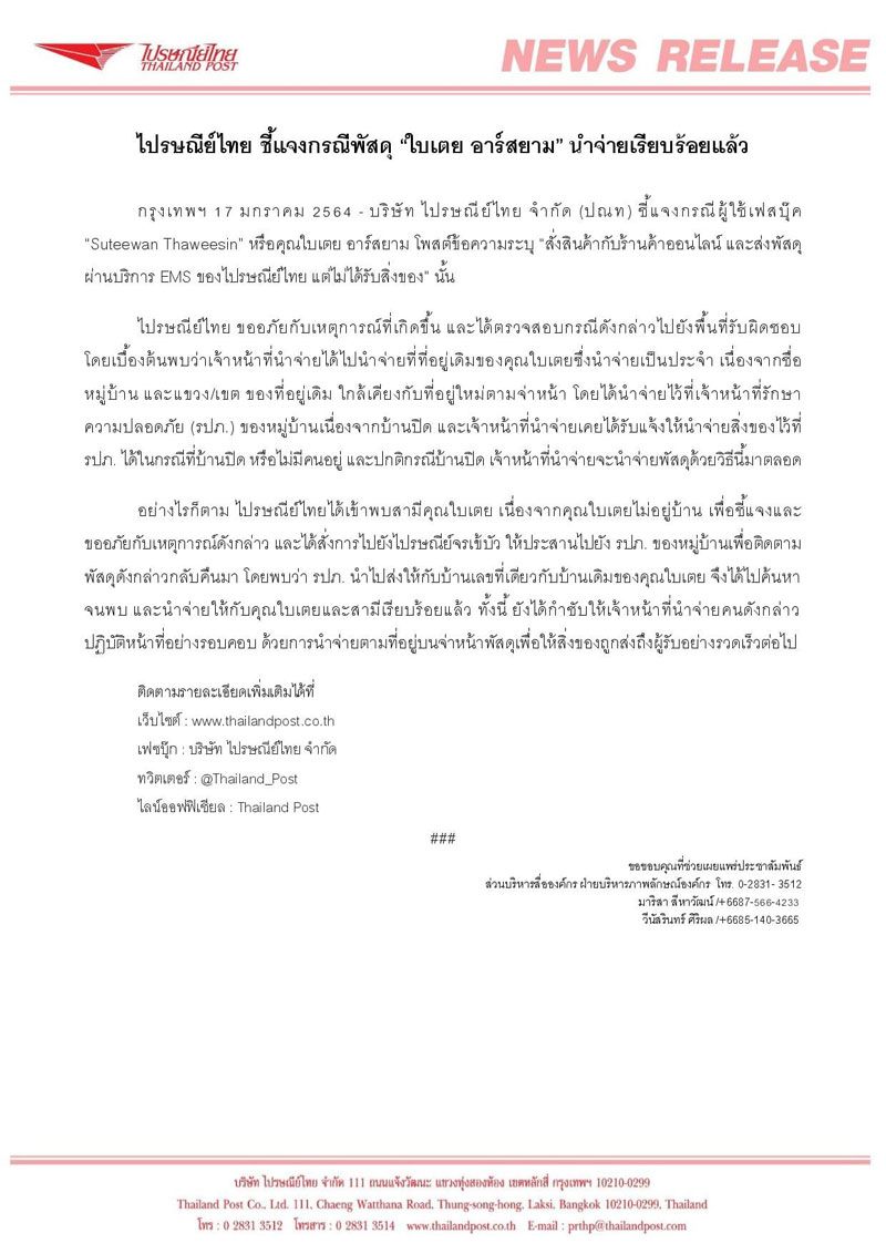 ล่าสุด เมื่อวันที่ 17 มกราคม 2564 เวลา 22.01 น. บริษัท ไปรษณีย์ไทย จำกัด ได้ออกหนังสือชี้แจงถึงกรณีดังกล่าว โดยมีข้อความว่า ” บริษัท ไปรษณีย์ไทย จำกัด (ปณท) ชี้แจงกรณีผู้ใช้เฟซบุ๊ก “Suteewan Thaweesin” หรือ คุณใบเตย อาร์สยาม โพสต์ข้อความระบุ “สั่งสินค้ากับร้านค้าออนไลน์ และส่งพัสดุผ่านบริการ EMS ของไปรษณีย์ไทย แต่ไม่ได้รับสิ่งของ” นั้น
