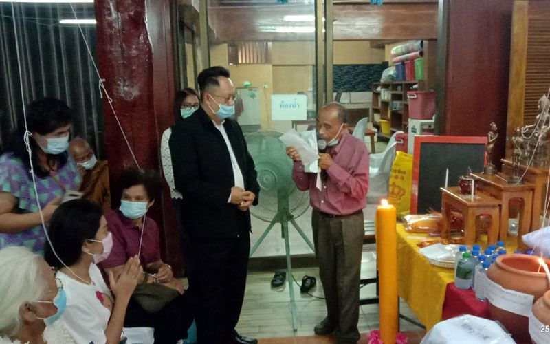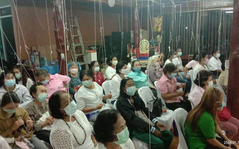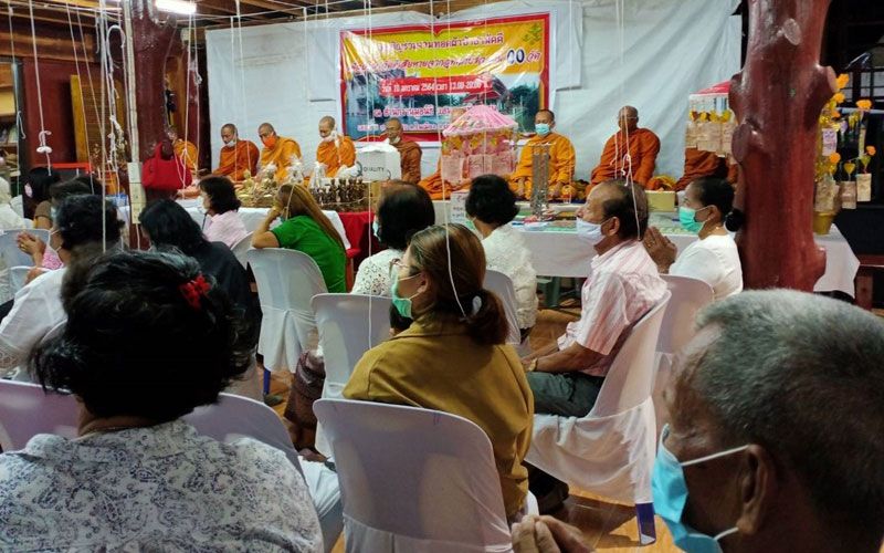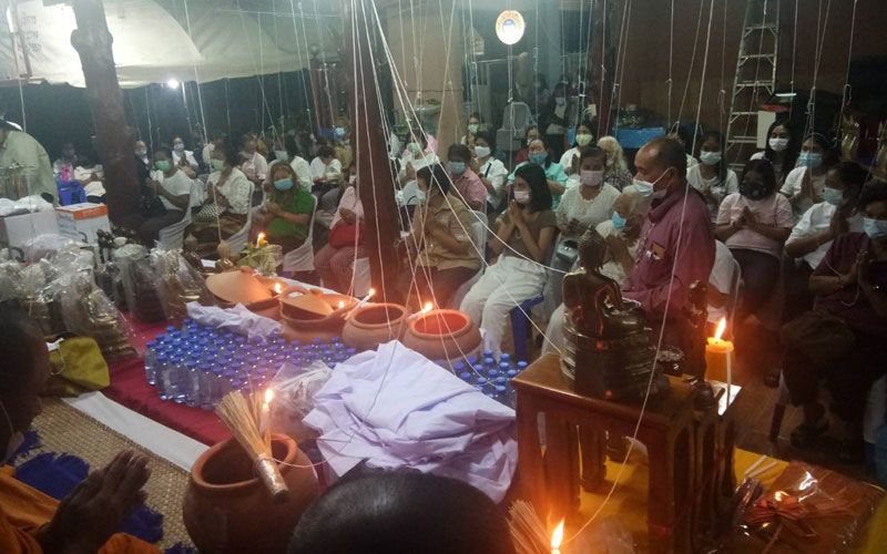 ในพิธีได้มีการบริกรรมคาถาสวดเสกน้ำมนต์ และวัตถุมงคลต่างๆ ที่ชาวบ้านเชื่อถือศรัทธา และเคารพกราบไหว้บูชา อย่าง “หัวนะโม”, “ไอ้ไข่” รุ่นป้องกันภัยสิบทิศ รวมถึงพระพุทธสิหิงค์ และของบูชาอื่นๆ จากพระเกจิอาจารย์ชื่อดังในจังหวัดจำนวน 10 รูปพร้อมสวดส่งขจัดปัดเป่าสิ่งชั่วร้าย เสริมดวงเพิ่มพลัง ป้องกันโรคภัยให้กับผู้ร่วมพิธี และคนไทยทั้งประเทศ เพื่อให้รอดพ้นจากโรคโควิด-19 ที่แพร่ระบาดอยู่ในขณะนี้ ตามความเชื่อของชาวพุทธ และเพื่อความเป็นสิริมงคลแก่ผู้ร่วมพิธี ซึ่งวัตถุมงคลที่ผ่านบริกรรมคาถา ได้แจกจ่ายให้ผู้ร่วมพิธี รวมถึงเปิดให้ผู้ที่มีจิตศรัทธาได้มีโอกาสนำไปบูชา โดยการร่วมกันบริจาคเงินปัจจัยตามพลังศรัทธา เพื่อรวบรวมทุนทรัพย์นำไปถวายให้วัดตามวัตถุประสงค์ดังกล่าว
