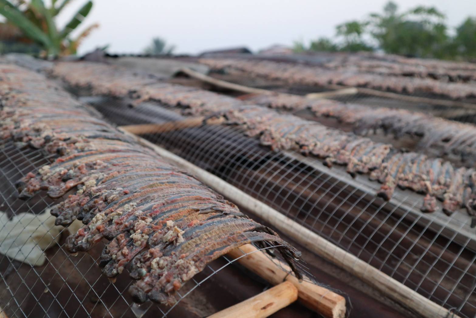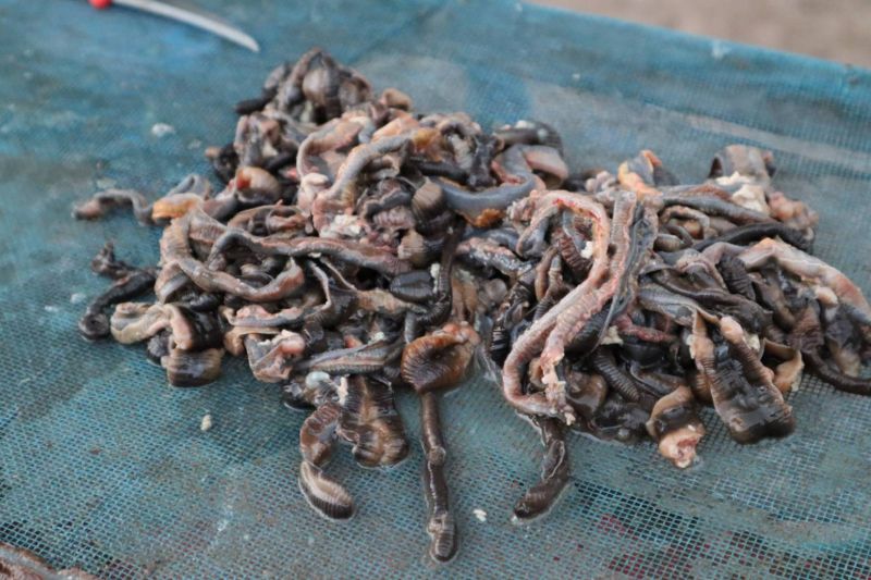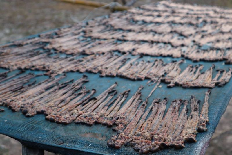 น.ส.เอ๋เล่าต่อว่าจากนั้นจะนำมาผ่านขั้นตอนการแปรรูป ที่เคยทำสืบทอดกันมา ด้วยการชำแหละเอาดินออก แล้วนำไปแช่ล้างด้วยน้ำเปลือกไม้ประดู่ให้สะอาด ก่อนนำไปตากแดดจนแห้ง โดยการแปรรูปไส้เดือนต้องลงมือทำตั้งแต่กลางดึก เพื่อให้ทันแดดออกในตอนเช้า บ่ายๆก็เก็บส่งขายได้เลย ปีนี้ทางประเทศจีนสั่งออเดอร์มาจำนวน 20 ตัน “ชาวบ้านสร้างรายได้เดือนละหลายหมื่นบาท บางครอบครัวขยันทำเงินได้เดือนละเป็นแสน ถ้าได้วัตถุดิบทำก่อนฤดูกาล ก็สามารถทำเงินได้มากกว่าทุกปี”นางนพมาศ กล่าว