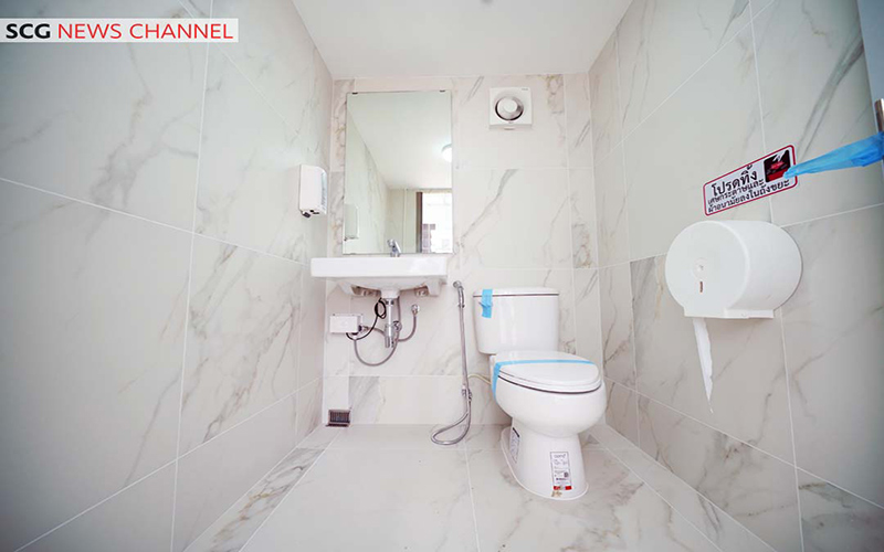 โดยใช้ชิ้นส่วนสำเร็จรูป ปูพื้นด้วยกระเบื้องเซรามิคทั้งห้อง เพื่อสะดวกในการทำความสะอาดและฆ่าเชื้อโรคด้วยสารเคมี มีอ่างล้างมือและสุขภัณฑ์อยู่ภายในห้องเดียวกัน เพื่อป้องกันการแพร่เชื้อโรคระหว่างผู้ใช้งานแต่ละห้อง มีฝักบัวอาบน้ำ ก๊อกน้ำอัตโนมัติ และสุขภัณฑ์คอตโต้ชนิดใช้งานหนัก วางจุดต่อเชื่อมระบบน้ำดีและสุขาภิบาลให้อยู่ในผนังด้านเดียว สะดวกในการเคลื่อนย้าย หรือปรับเปลี่ยนจุดให้เหมาะสมกับสถานการณ์ด้วยหลังคาคลุมในลักษณะเต็นท์มีการระบายอากาศได้ดี ออกแบบและผลิตโดย บริษัท สยามซานิทารีแวร์ อินดัสทรี ซึ่งเป็นบริษัทในเครือเอสซีจี ซึ่งจะช่วยบรรเทาความเดือดร้อนในระยะเร่งด่วนให้ชาวไทยเเละแรงงานต่างชาติ ที่ติดเชื้อโควิด –19