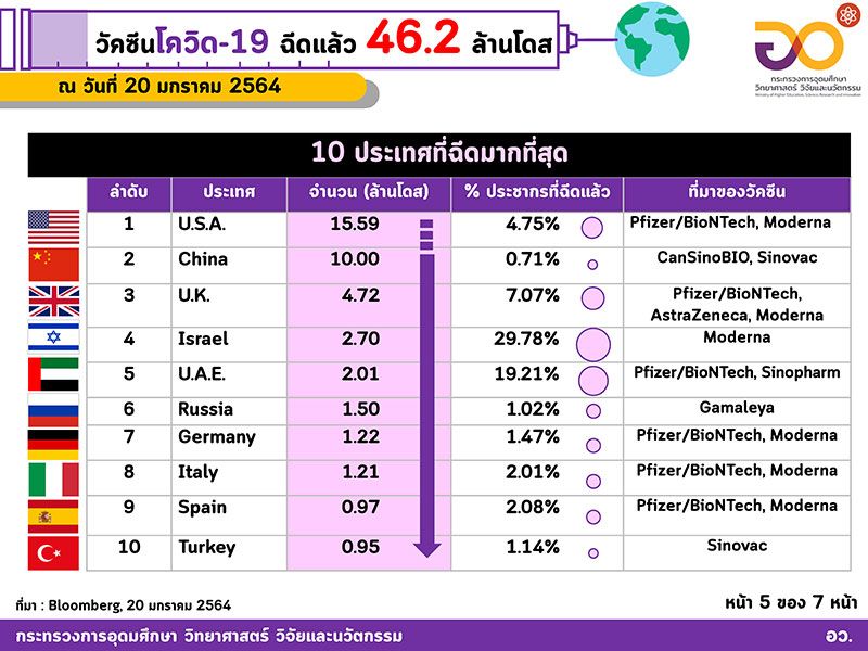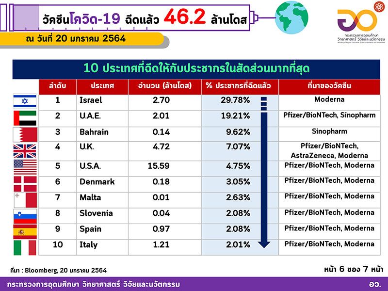 20 มกราคม 2564 ศาสตราจารย์ ดร. นายแพทย์สิริฤกษ์ ทรงศิวิไล ปลัดกระทรวงการอุดมศึกษา วิทยาศาสตร์ วิจัยและนวัตกรรม (อว.) รายงานผลการประมวลข้อมูลเกี่ยวกับการใช้วัคซีนโควิด-19 ว่า “ขณะนี้ได้มีการฉีดวัคซีนไปแล้ว 46.2 ล้านโดส ใน 51 ประเทศทั่วโลก เพิ่มขึ้นวันละ 2.35 ล้าน คนอเมริกันได้รับแล้วมากที่สุด 15.6 ล้านโดส ในขณะที่คนอิสราเอลหนึ่งในสี่คนฉีดวัคซีนแล้ว