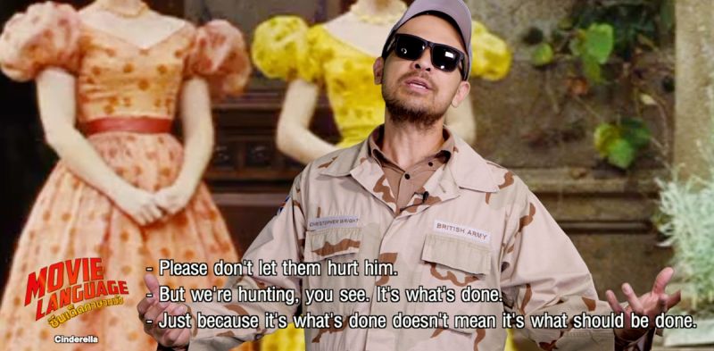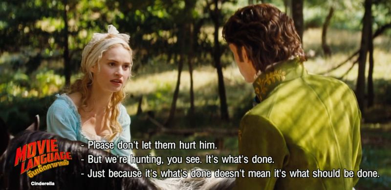 จัดไปกับฉากแรกที่ “ซินเดอเรลล่า” เจอ “เจ้าชาย” ในระหว่างที่กำลังล่ากวางป่า ครูคริส และ ครูเต้ จึงอธิบายถึงคำว่า “Stag” (สแต็ก) ซึ่งแปลว่า “กวางตัวผู้” และประโยคที่ซินเดอเรลล่า ไม่เห็นด้วยกับกิจกรรมล่าสัตว์ที่คนชนชั้นสูงปฏิบัติต่อๆ กันมาและกล่าวกับเจ้าชายว่า “Just because it’s what’s done doesn’t mean it’s what should be done” (เพียงเพราะเขาทำอย่างนั้นกันมา ก็ใช่ว่าเราควรจะต้องทำตามอย่างนั้นด้วย) รวมไปถึงคำศัพท์อื่นๆ เช่น “Stepsister” (สเต็ปซิสเทอร์) พี่น้องต่างแม่ และอีกมากมาย มีการความหมาย และวิธีการใช้อย่างไร ติดตามชมได้ในรายการ “ซีนเด็ด..ภาษาหนัง (Movie Language)” วันอาทิตย์ที่ 24 ม.ค.2564 เวลา 17.55 น. ทางทีวีดิจิตัล หมายเลข 29 และแอปพลิเคชั่น MONO29