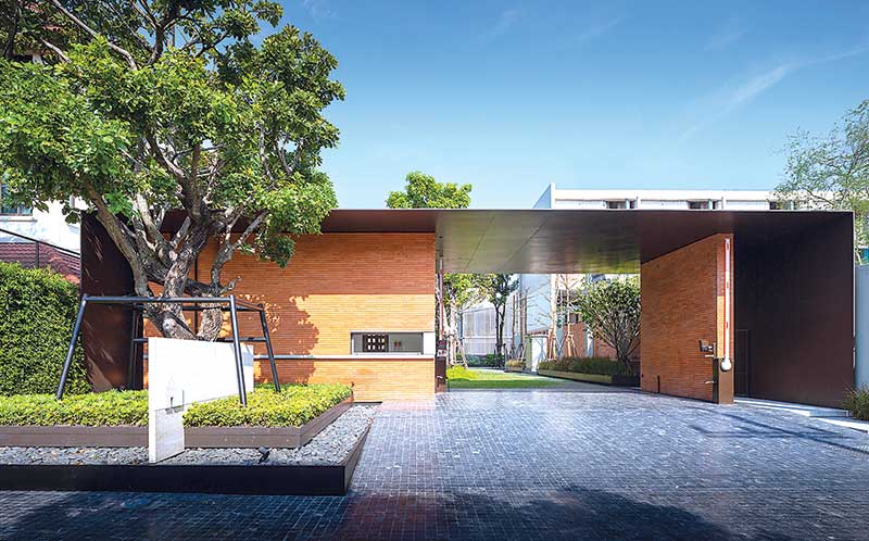 ชุติพงษ์ได้สร้างสัมผัสความร่มรื่น อบอุ่นของคำว่า “บ้าน” ตั้งแต่หน้าโครงการไปจนถึงหน้าประตู “เราอยากให้คนที่เข้ามาในโครงการรู้สึกได้ว่าเขากำลังกลับบ้าน ข้างในนั้นเปรียบเสมือนบ้านหลังใหญ่หลังหนึ่ง เราจึงไม่ได้มุ่งเน้นไปที่ความอลังการของทางเข้าหมู่บ้านให้สูงและตระการตา แต่เราอยากให้คุณรู้สึกร่มรื่น อบอุ่นเหมือนคุณกำลังจะกลับบ้านเท่านั้นเอง เราเลือกวัสดุปูถนนแบบนี้เพื่อให้คุณขับรถช้าลง และเลือกที่จะทิ้งพื้นที่ทางเข้าของโครงการทั้งหมดนี้ไว้เพื่อเป็นสวน เป็นพื้นที่สีเขียวเพื่อปรับความรู้สึกกันสักนิดก่อนที่คุณจะเดินทางเข้าบ้านของคุณจริงๆ”