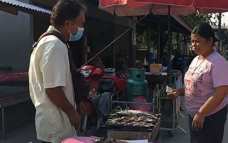 แต่! พอมีโรคระบาดโควิด – 19 ลุงเลยตัดสินใจกลับมาอยู่บ้าน อีกอย่างอายุก็มากแล้วด้วย อยู่บ้านเริ่มเลี้ยงปลามีทั้งปลานิล ปลาช่อน ปลาดุก ปลาหมอ เมื่อโตก็จับมาย่าง – ปิ้งขาย ช่วงเวลา 14.00 น. บริเวณด้านหน้าร้านค้าประชารัฐของชุมชน ขายทุกวัน หมดทุกวัน ปลาไม้ละ 20 บาท เลี้ยงเองขายเองกำไรได้เล็กน้อยก็ไม่เป็นไร ขายให้ชาวบ้านในชุมชนด้วยกัน ลุงขายวันละ 40-50 ไม้ พอเรื่มย่าง – ปิ้ง ลูกค้าก็จะมาจองไว้ แล้วกลับบ้านไปทำงานต่อ เพราะถ้าไม่จองไว้ ปลาหมดก่อนแน่นอน จึงไม่กังวลในแต่ละวันยังไงก็ขายหมดอยู่แล้ว แต่จะไม่ทำเพิ่ม เพราะอาจทำให้ขายไม่หมดได้ เก็บเล็กผสมน้อยไปแบบนี้ดีกว่า
