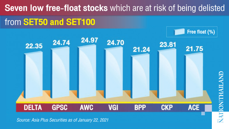 Seven low free-float stocks are at risk of being delisted from the SET50 and SET100 indices after the Stock Exchange of Thailand (SET) implemented free float adjusted market capitalisation regulations.