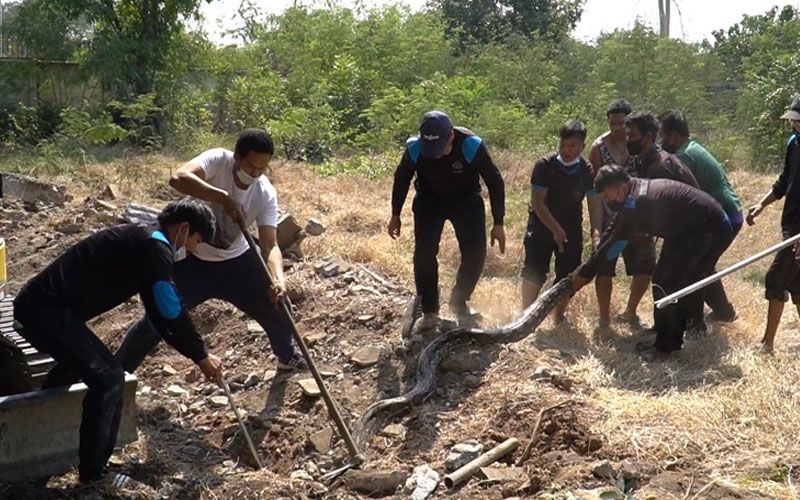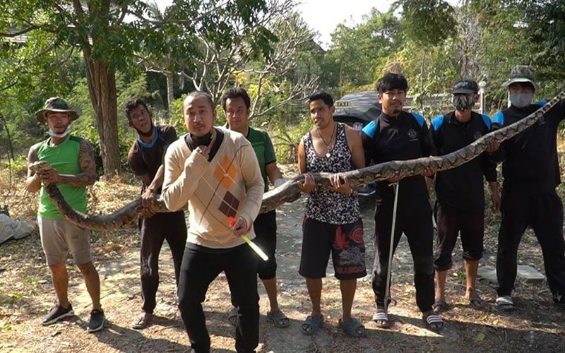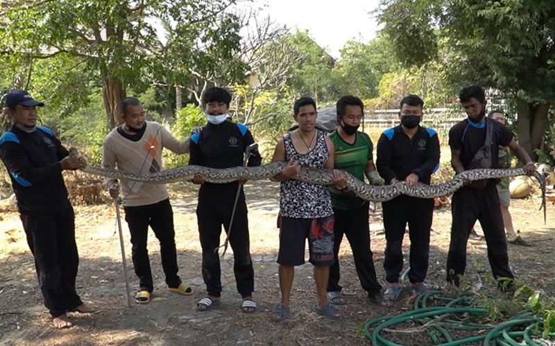 กู้ภัยชัยนาทจับงูเหลือมยักษ์เจ้าที่คู่ผัวเมียยาว 5 เมตรคอหวยแห่ตีเลขเด็ด