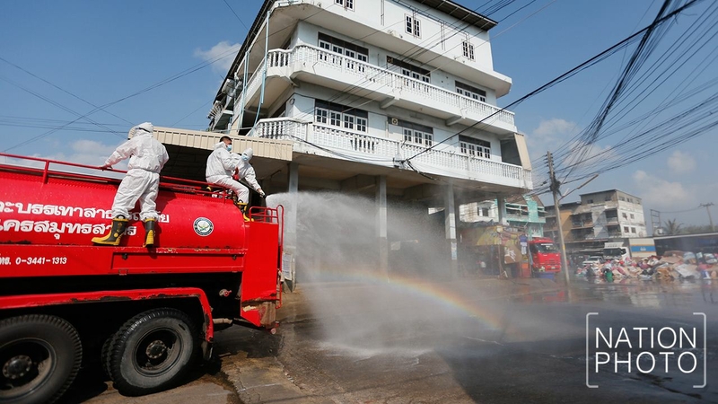 Samut Sakhon’s Central Shrimp Market was hosed down with disinfectant in a bid to contain the spread of Covid-19 on Monday.