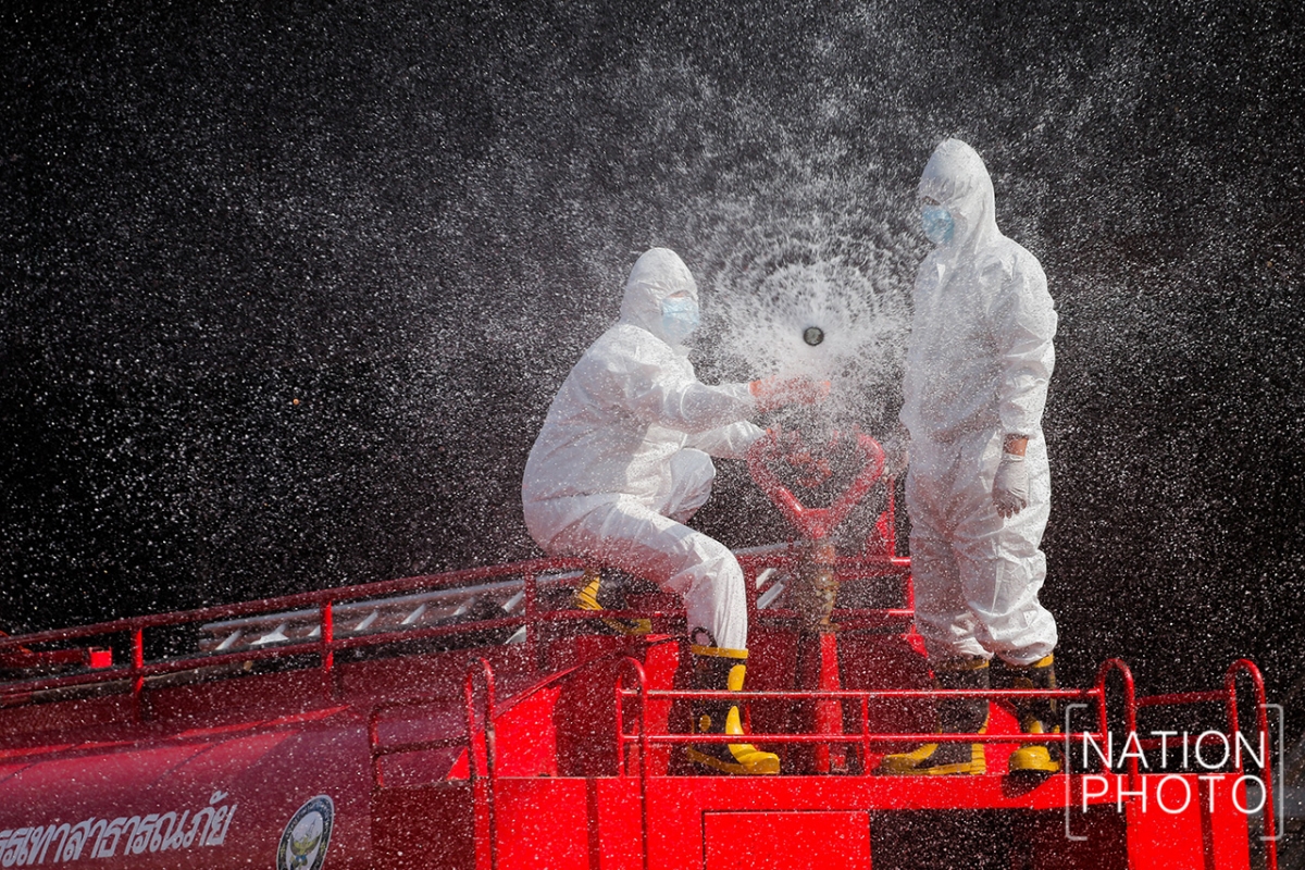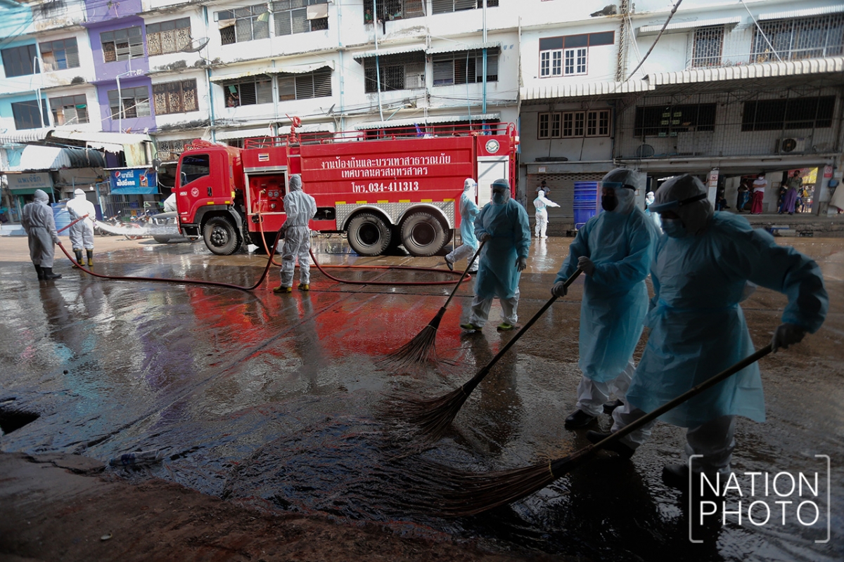 Samut Sakhon’s Central Shrimp Market was hosed down with disinfectant in a bid to contain the spread of Covid-19 on Monday.