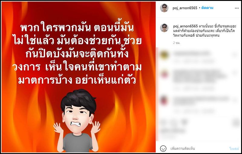 ล่าสุด พชร์ อานนท์ ออกมาโพสต์อินสตาแกรมเกี่ยวกับกรณีนี้ว่า ” พวกใครพวกมัน ตอนนี้มันไม่ใช่แล้ว มันต้องช่วยกัน ช่วยกันปิดบัง มันจะติดกันทั้งวงการ เห็นใจคนที่เขาทำตามมาตรการบ้าง อย่าเห็นแก่ตัว ”