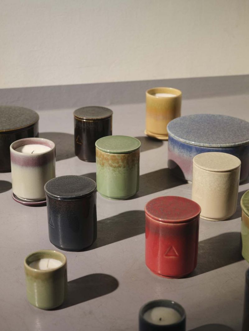 เทียนหอม OSYNLIG/โอซืนลิก บรรจุในภาชนะเซรามิกสองโทนสีที่ผสมผสานกัน สื่อถึงส่วนผสมของเทียนหอมกลิ่นนั้นๆ สัญลักษณ์รูปสามเหลี่ยมหมายถึงระดับกลิ่นหอม ท็อปโน้ต มิดเดิ้ลโน้ต และเบสโน้ต การออกแบบเน้นใช้งานได้