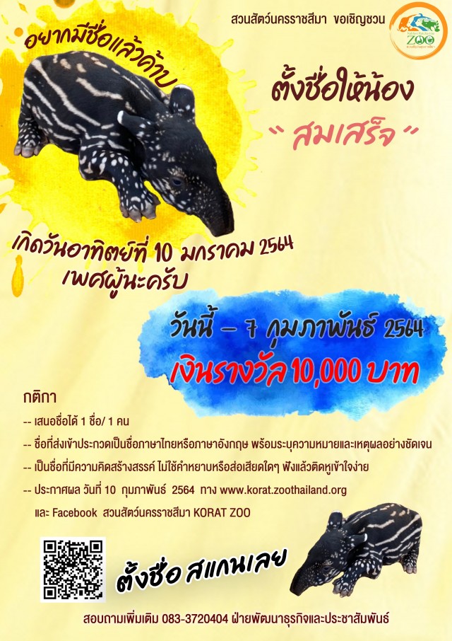 Nakhon Ratchasima Zoo, or Korat Zoo, is inviting people to name a newborn tapir and stand a chance to win Bt10,000.
