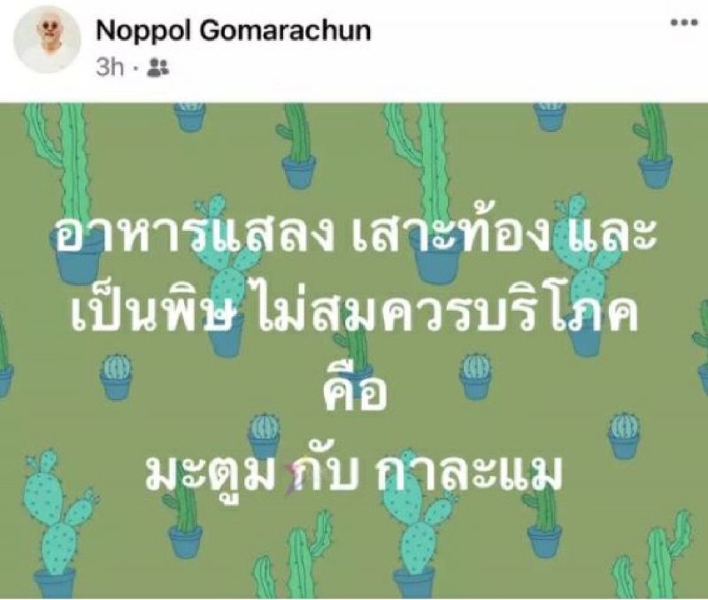 28 ม.ค.64 ทำเอาชาวเน็ตสงสัยทันที หลังนักแสดงรุ่นใหญ่ ดีกรีผู้จัดอย่าง “ตู่ นพพล โกมารชุน” ที่อยู่ๆ ออกมาโพสต์ในเฟซบุ๊กส่วนตัว ระบุว่า “อาหารแสลง เสาะท้อง และเป็นพิษ ไม่ควรบริโภค คือ มะตูม กับ กาละแม” จากนั้นมีชาวเน็ตเข้ามากดไลก์ใต้โพสต์ดังกล่าวจำนวนมาก