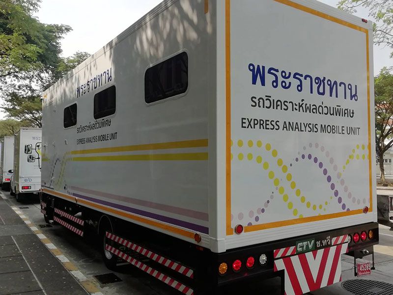 รถวิเคราะห์ผลด่วนพิเศษ พระราชทาน มีเพียงคันเดียวในประเทศไทย และออกปฏิบัติงานที่จังหวัดสมุทรสาครเป็นจังหวัดแรก ซึ่งก่อนหน้านี้เจ้าหน้าที่ได้เคยนำ รถวิเคราะห์ผลด่วนพิเศษ พระราชทาน ไปปฏิบัติงานที่กรมประชาสัมพันธ์ เพื่อเป็นการทดสอบระบบ และครั้งนี้ถือเป็นการทดสอบการปฏิบัติงานจริงเป็นครั้งแรก โดยภายในรถจะถูกแบ่งเป็นห้องต่างๆจำนวน 2 ห้อง ซึ่งจะมีเครื่องมือการตรวจที่ทันสมัย และมีพื้นที่กำจัดขยะติดเชื้อที่แบ่งเป็นสัดส่วนบริเวณพื้นทางเดินของรถ ทั้งนี้ รถวิเคราะห์ผลด่วนพิเศษ พระราชทาน จะถูกนำมาจอดปฏิบัติงานที่บริเวณลานด้านศาลากลางจังหวัดสมุทรสาคร เพื่อรับตัวอย่างสารคัดหลั่งจากรถเก็บตัวอย่างชีวนิรภัย พระราชทาน