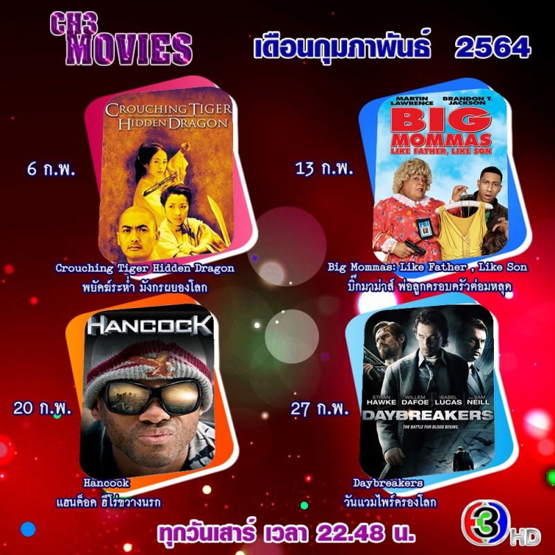 บอกเลยว่าคอหนัง “แชนแนลทรีมูฟวี่ส์” เตรียมตัวรับความสุขในเดือนแห่งความรักไปเต็มๆ ได้เลย ตลอดทั้งเดือนกับ 4 หนังคุณภาพดีเกินต้านในทุกคืนวันเสาร์เวลา 22.48 – 01.18 น. ทางช่อง 3 กด 33
