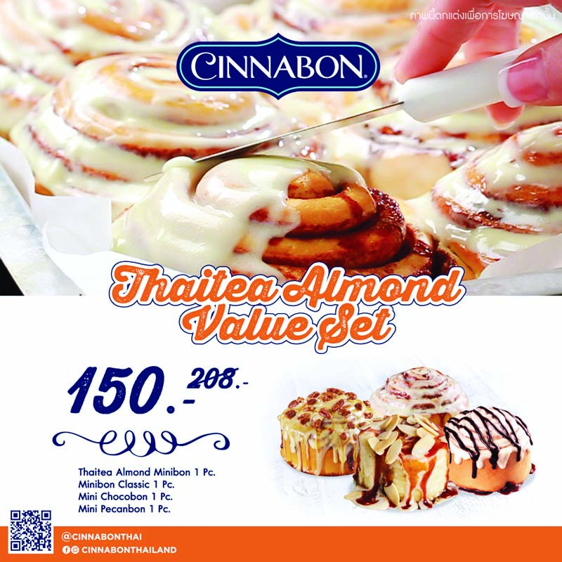 ซินนาบอน ชวนชิม “Cinnabon Thaitea Almond Value Set”4 รสชาติ ได้แก่ ชาไทยอัลมอนด์,มินิบอนคลาสสิก, มินิช็อกโกบอนและมินิพีแคนบอน ในราคาเซตละ150 บาท ที่ ร้านซินนาบอน สาขาสยามพารากอน, สีลมคอมเพล็กซ์,เทอร์มินอล 21 อโศก และ สามย่านมิตรทาวน์