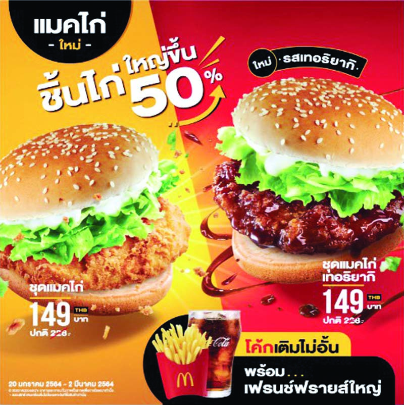 แมคโดนัลด์ ชวนชิม “แมคไก่เทอริยากิ” รสชาติใหม่สไตล์ญี่ปุ่น ชิ้นใหญ่กว่าเดิมถึง 50% พร้อมเฟรนช์ฟรายส์ใหญ่ และโค้กรีฟิล เริ่มต้นชุดละ 149 บาท ถึง 2 มี.ค. ที่ ร้านแมคโดนัลด์ทุกสาขา โทร.1711