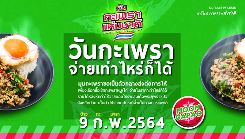 มุมกะเพรา…จานด่วน ชวนชิมเมนูกะเพราหมูอนามัยหรือ กะเพราไก่อนามัย ฉลองวันกะเพราแห่งชาติ 9 ก.พ. โดยรายได้ทั้งหมดหลังหักค่าใช้จ่าย มอบให้โรงพยาบาลสมเด็จพระยุพราชปัว จ.น่าน เพื่อซื้ออุปกรณ์ทางการแพทย์ที่จำเป็น ที่ ร้านมุมกะเพรา ทุกสาขา โทร.08-15499919