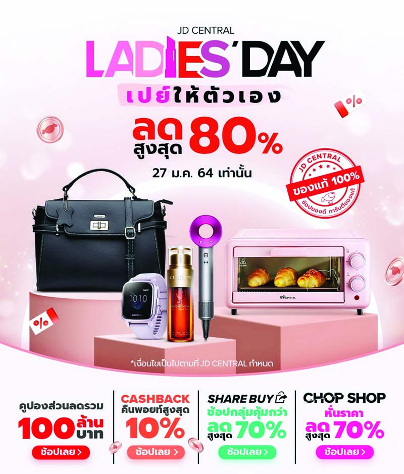 เจดีเซ็นทรัล ชวนช็อปในแคมเปญ “JD CENTRAL Ladies’ Day” ด้วยสินค้าแบรนด์ดังที่คัดสรรพิเศษสำหรับผู้หญิงโดยเฉพาะ พร้อมส่วนลดสูงสุดกว่า 80% ทุกวันพุธต้นเดือนและปลายเดือนตลอดทั้งปี ที่ www.jd.co.th