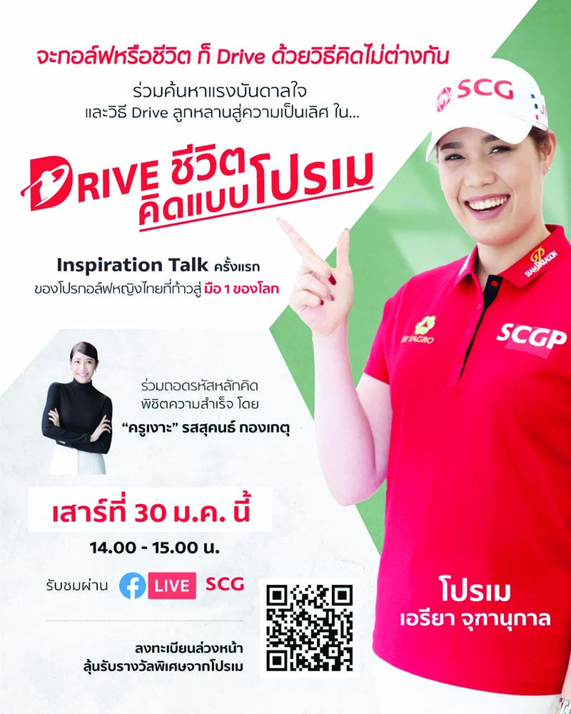 เอสซีจี ชวนชม Inspiration Talk ครั้งแรกของ “โปรเม-เอรียา จุฑานุกาล”โปรกอล์ฟหญิงไทยคนแรกที่ก้าวสู่อันดับ 1 ของโลกในหัวข้อ “Drive ชีวิต คิดแบบโปรเม” พร้อมส่งต่อแรงบันดาลใจสู่เส้นทางฝันและความเป็นเลิศ ในวันเสาร์ที่ 30 ม.ค.เวลา 14.00-15.00 น.ทาง Facebook : SCG fanpage
