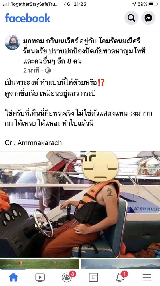 วันที่ 29 มกราคม 2564 ผู้สื่อข่าวรายงานว่า ขณะนี้ โลกโซเชี่ยลฯได้มีการแชร์ โดยผู้ใช้เฟซบุครายหนึ่ง เป็นภาพชายแต่งกายคล้ายพระสงฆ์และสามเณร สวมเสื้อชูชีพ ท่อนล่างนุ่งผ้าเหลือง ทำท่าขับเรือสปีดโบท อย่างสบายใจ ขณะเดินทางไปท่องเที่ยวทะเล พร้อมข้อความ “เป็นพระสงฆ์ ทำแบบนี้ได้ด้วยหรือ? ดูจากชื่อเรือ เหมือนอยู่แถว กระบี่ ….ใช่ครับที่เห็นนี่คือพระจริง ไม่ใช่ตัวแสดงแทน งงมากกกก ได้เหรอ ได้แหละ ทำไปแล้วนิ”