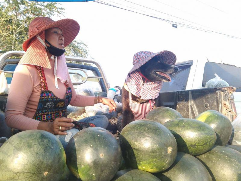 ผู้สื่อข่าวจึงเดินทางไปตรวจสอบพบสุนัขดังกล่าว กำลังช่วยเจ้าของขายแตงโม โดยใส่หมวก และคล้องผ้ากันเปื้อนแบบแม่ค้าน่ารักน่าชัง และเป็นที่ขบขันของคนที่ผ่านไปมา