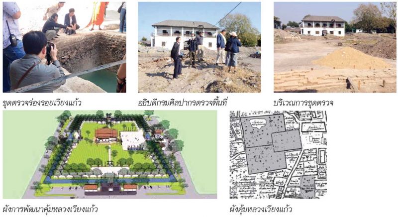 สำหรับการขุดตรวจสำรวจนั้นทำให้พบข้อมูลทางโบราณคดีที่พบแนวอิฐวางตัวด้านทิศเหนือของพื้นที่โครงการ และเมื่อนำภาพทับซ้อนแผนที่มาดู จึงพบว่าแนวอิฐนี้น่าจะเป็นกำแพงที่แบ่งพื้นที่วังส่วนเหนือและส่วนใต้ รวมถึงยังพบแนวอิฐที่กลางบริเวณกลางพื้นที่โครงการกระจายหลายกลุ่มโดยอาคารเหล่านี้วางตัวเฉียงจากแนวแกนทิศตะวันออก-ตะวันตกไปทางเหนือ ๑๐ องศา เช่นเดียวกับแนวกำแพงด้านใต้และด้านเหนือที่พบ จนทำให้ “เวียงแก้วหรือคุ้มหลวงเวียงแก้ว” นี้ ถูกกล่าวถึงมากขึ้นทันที ข้อมูลเบื้องต้นบนดินนั้นประมาณเอาว่าเมื่อที่เจ้าหลวงอินทวิชยานนท์ขึ้นครองเมืองเชียงใหม่ใน พ.ศ.๒๔๑๔ แล้วได้มีการรื้อหอคำของเจ้าหลวงองค์ก่อนไปปลูกถวายวัดในเชียงใหม่ และย้ายไปประทับอยู่ยังวังแห่งใหม่ บริเวณโรงเรียนยุพราชในปัจจุบัน ตามแผนที่โบราณนครเชียงใหม่ พ.ศ.๒๔๓๖ ซึ่งชี้ให้เห็นว่าพื้นที่เวียงแก้วอาจมิได้ใช้งานเป็นวังมาตั้งแต่ พ.ศ.๒๔๑๔ หรือหลังจากนั้นแล้วพื้นที่เวียงแก้วก็ถูกกลับมาใช้งานอีกครั้งในสมัยเจ้าอินทวโรรส ยกให้ใช้เป็นเรือนจำมณฑลพายัพในราวปี พ.ศ.๒๔๕๑ ส่วนเรื่องใต้ดินนั้นยังรู้ไม่หมดต้องอาศัยข้อมูลตรวจสอบกันเท่าที่มี เช่นพงศาวดารโยนก กล่าวว่า ท้าวพระยารามัญผู้รั้งเมืองนครเชียงใหม่ ได้กระทำการอุกอาจมิได้อ่อนน้อมต่อพระเจ้านครเชียงใหม่นั้นแล้ว ก็ชวนให้เชื่อว่า ท้าวพระยารามัญผู้รั้งเมืองนครเชียงใหม่ที่กระทำการอุกอาจในคราวนั้นคงจะได้จัดค่ายซึ่งเป็นที่พำนักในบริเวณข่วงหลวงนั้นให้เป็นประดุจเมืองที่มีค่ายคูประตูหอรบพร้อมสรรพ ชาวนครเชียงใหม่ในเวลานั้นจึงคงจะเรียกค่ายพำนักของท้าวพระยารามัญผู้รั้งเมืองนครเชียงใหม่นั้นว่า “เวียงหน้าคุ้มแก้ว”