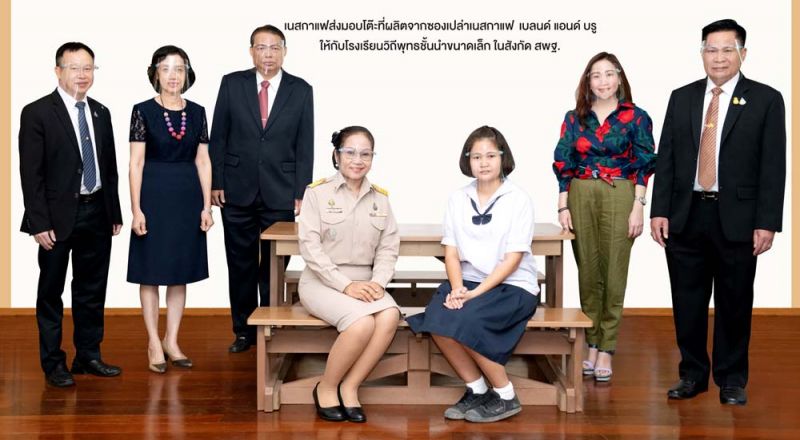 ศรีประภา จิงประเสริฐสุข ผู้จัดการธุรกิจกาแฟสำเร็จรูปและครีมเทียม บริษัท เนสท์เล่ (ไทย) จำกัด มอบชุดโต๊ะรับประทานอาหารพร้อมเก้าอี้ชุดแรก ซึ่งเป็นไม้เทียมทำจากซองเปล่า เนสกาแฟ เบลนด์ แอนด์ บรู ที่ใช้นวัตกรรมการผลิตไม้เทียมเพื่อสิ่งแวดล้อม ในโครงการ “เนสกาแฟ อัพไซคลิ่ง” ให้แก่โรงเรียนจรัสวิทยาคาร ซึ่งเป็นโรงเรียนวิถีพุทธขนาดเล็กในสังกัดสำนักงานคณะกรรมการการศึกษาขั้นพื้นฐาน หรือ สพฐ. เพื่อใช้ในโรงอาหาร โดยมี อัมพร พินะสา เลขาธิการคณะกรรมการการศึกษาขั้นพื้นฐาน เป็นประธานในพิธีรับมอบ พร้อมด้วย ดร.อโณทัย ไทยวรรณศรี ผู้อำนวยการสำนักพัฒนานวัตกรรมการจัดการศึกษา สพฐ. ดร.บรรเจอดพร สู่แสนสุข รองผู้อำนวยการสำนักพัฒนานวัตกรรมการจัดการศึกษา สพฐ. ผู้บริหารโครงการโรงเรียนวิถีพุทธ ธารทิพย์ ศรีบูรพาภิรมย์ ผู้อำนวยการโรงเรียนจรัสวิทยาคาร พร้อมด้วย ทวี อนันตรัตนา กรรมการผู้จัดการ บริษัท เบสท์ โพลิเมอร์ อินเตอร์เนชั่นแนล จำกัด และ ศิริภักตร์ พิญญะชิต ตัวแทนนักเรียน ร่วมเป็นสักขีพยาน ณ ห้องประชุม สพฐ. 1 อาคาร สพฐ. 4 ชั้น 2 กระทรวงศึกษาธิการ ทั้งนี้ เนสกาแฟจะมอบชุดโต๊ะรับประทานอาหารพร้อมเก้าอี้ดังกล่าวทั้งหมด 200 ชุด ซึ่งอัพไซคลิ่งจากซองเนสกาแฟ เบลนด์ แอนด์ บรู รวมทั้งสิ้น 16 ล้านซอให้กับโรงเรียนวิถีพุทธขนาดเล็กในสังกัด สพฐ. 100 โรงเรียนทั่วประเทศ